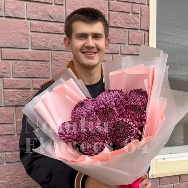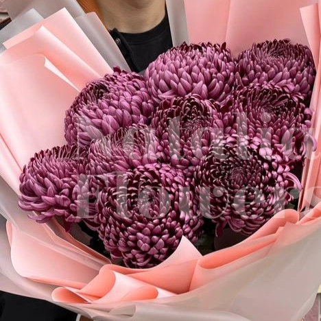 Букет из крупных пышных бордовых хризантем, элегантно завёрнутый в мягкую светло-розовую бумагу, создаёт элегантный и романтичный образ. Сочетание насыщенного бордового цвета цветов с нежными оттенками упаковки придаёт композиции особую выразительность и изысканность. Этот букет идеально подойдёт для значимых моментов и станет прекрасным выражением внимания и заботы.