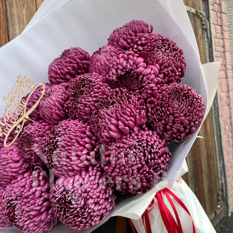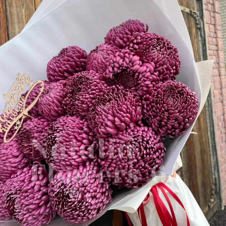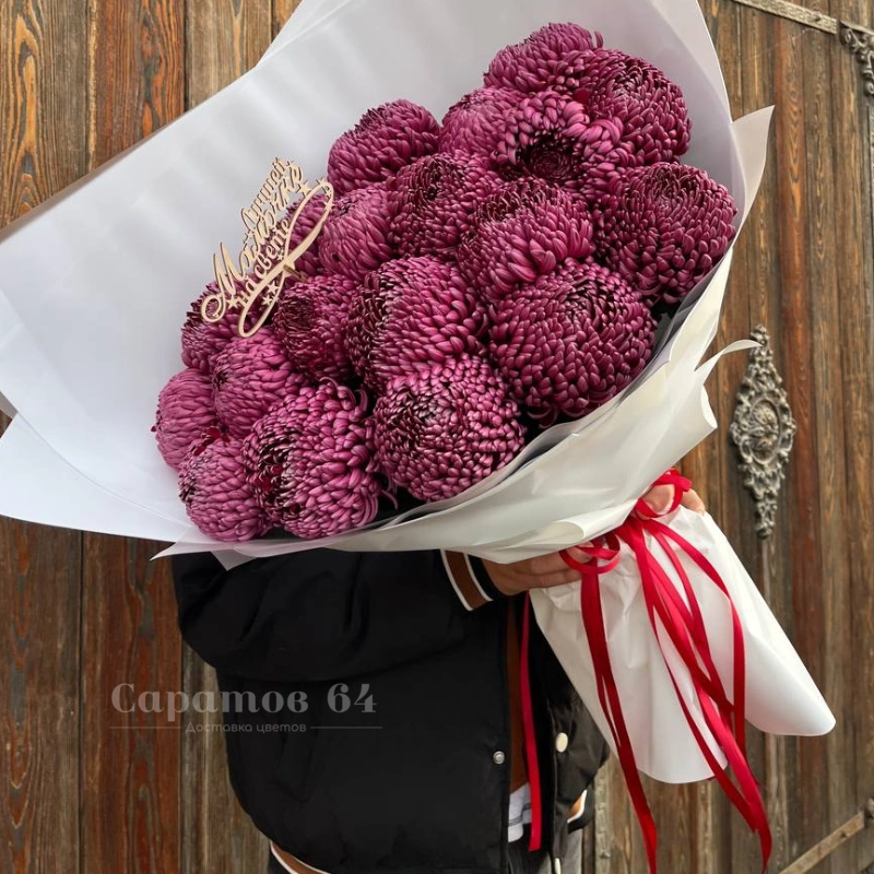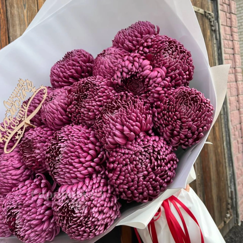 Букет из пышных бордовых хризантем, великолепных в своей простоте. Композиция из свежих цветов, перевязанная яркой красной лентой, станет эффектным подарком. Хризантемы символизируют долголетие и радость, олицетворяя элегантность и безмятежность.