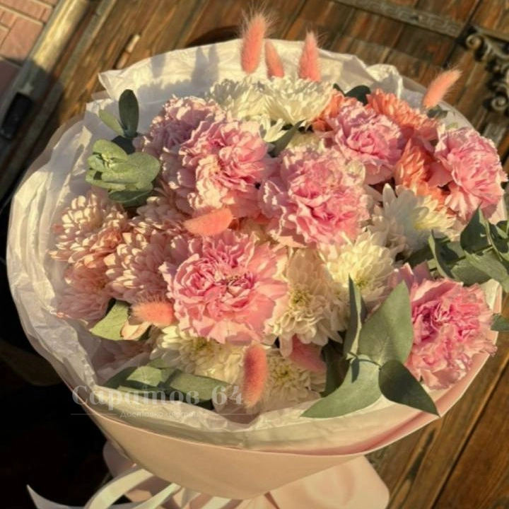 Нежный и воздушный букет, состоящий из розовых и белых гвоздик, пушистых отростков и зеленых листьев, создает легкую и романтичную композицию. Пудрово-персиковая гамма цветов добавляет букету женственность и элегантность. Деликатная упаковка с атласной лентой завершает образ, делая букет идеальным подарком.