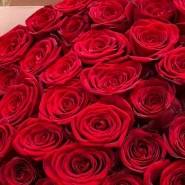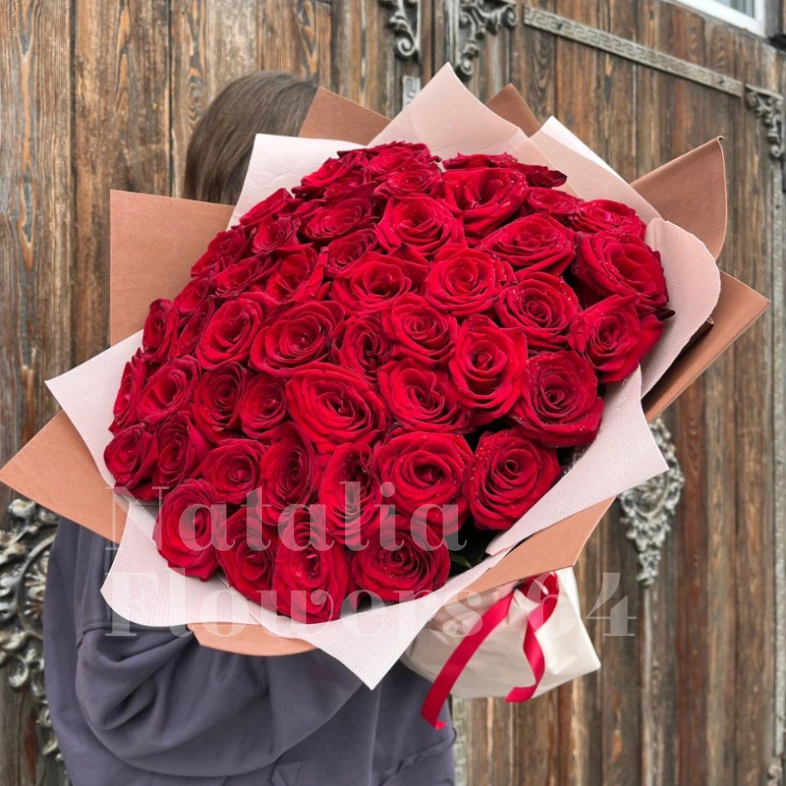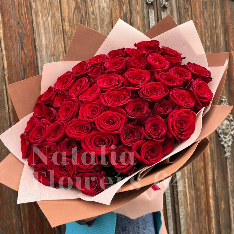 Роскошный букет из 51 бархатной красной розы, великолепный подарок для самых значимых моментов. Насыщенный алый цвет и безупречная форма цветов создают атмосферу торжественности и романтики. Букет элегантно упакован в мягкую бежевую бумагу, подчеркивающую красоту и свежесть цветов.