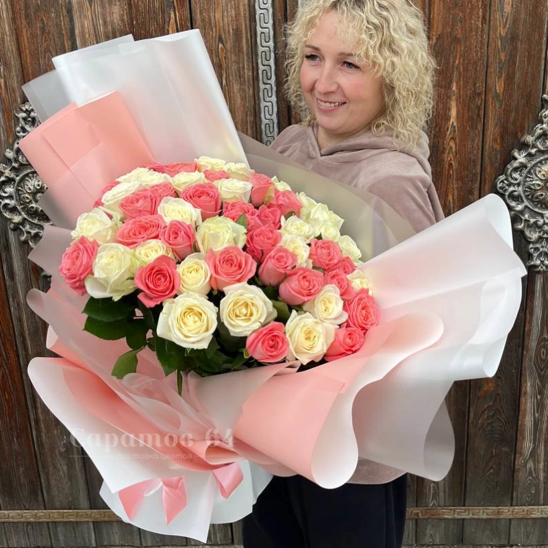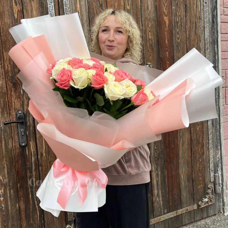 Букет «Нежное очарование» Этот букет - настоящее произведение искусства, созданное из нежных роз белого и розового оттенков. Он идеально подойдёт для выражения любви, благодарности или просто для того, чтобы сделать день особенным.