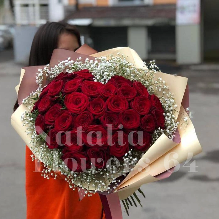 Букет из 55 роскошных темно-красных роз, элегантно дополненных нежными белыми цветами гипсофилы, создает трогательный и изысканный образ, идеально подходящий для выражения глубоких чувств и романтических признаний. Благодаря своему богатому и насыщенному цвету, этот букет становится выразительным символом любви и особого внимания. Упаковка в светлую бумагу с добавлением воздушных белых акцентов придает композиции утонченный и завершенный вид, делая ее идеальным выбором для дорогих подарков и торжественных моментов.