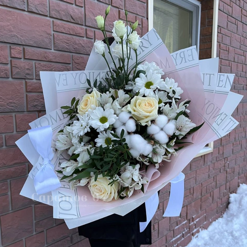 Букет "Нежность" - это изящное сочетание белых роз, ромашек и лилий, дополненное пушистым хлопком. Нежные оттен