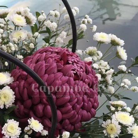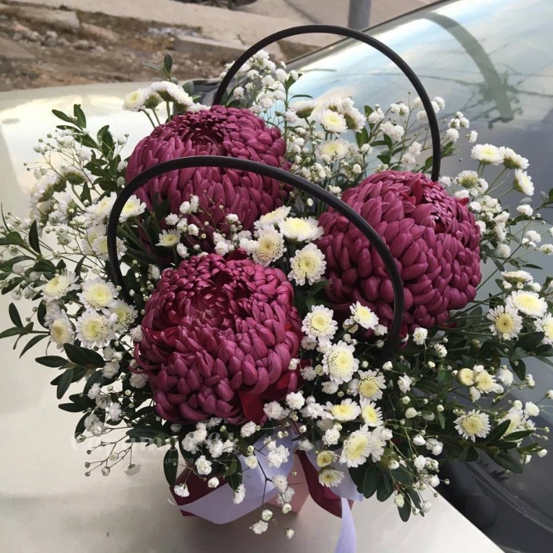 Букет, представленный в изящной корзинке с ажурной ручкой, - это элегантная композиция из крупных бузонов розовой хризантемы и мелких белых ромашек. Нежные белые цветы эффектно дополняют насыщенный цвет хризантем, создавая воздушную и романтичную атмосферу. Этот букет станет прекрасным подарком для тех, кто ценит красоту и изящество.