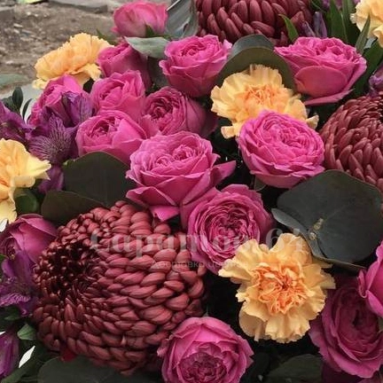 Букет в коробке являет собой яркую комбинацию розовых роз, крупных бордовых скабиоз и желтых гвоздик, украшенных нежно-зелеными веточками эвкалипта и дополненных атласной лентой. Собранные в элегантную композицию, эти цветы создают эффектную и запоминающуюся аранжировку. Пышный букет обязательно порадует яркими красками и насыщенными ароматами.
