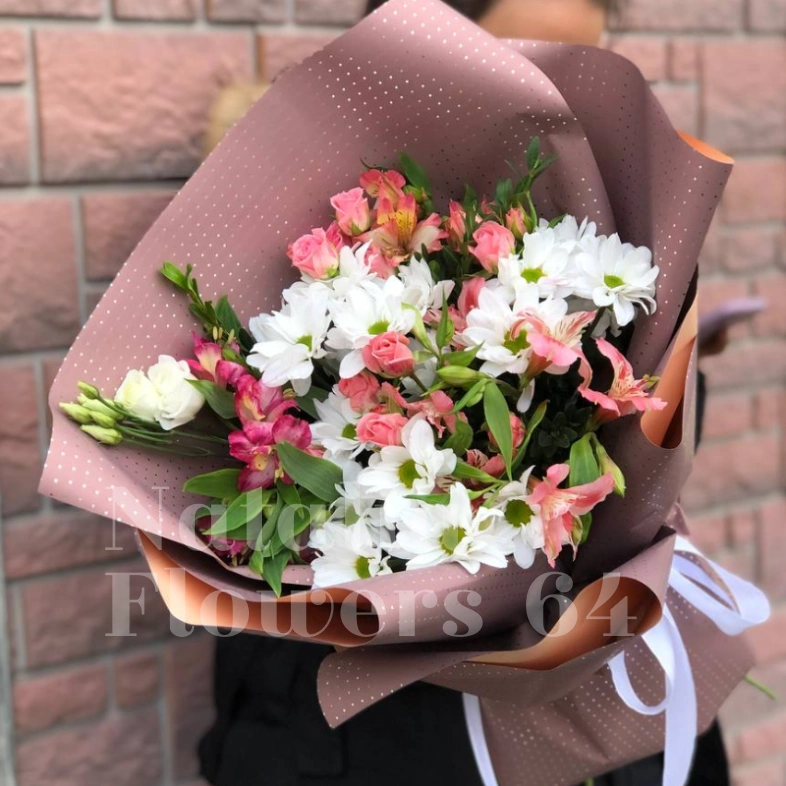 Букет представляет собой нежную композицию из белых и розовых цветов, создающую элегантное и романтическое настроение. В букете присутствуют ромашки, альстромерии и розы, сочетание которых добавляет ему свежести и изящества. Такой букет станет прекрасным подарком для близкого человека.