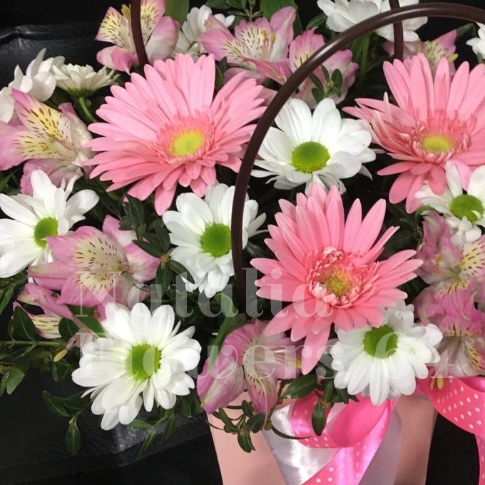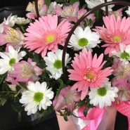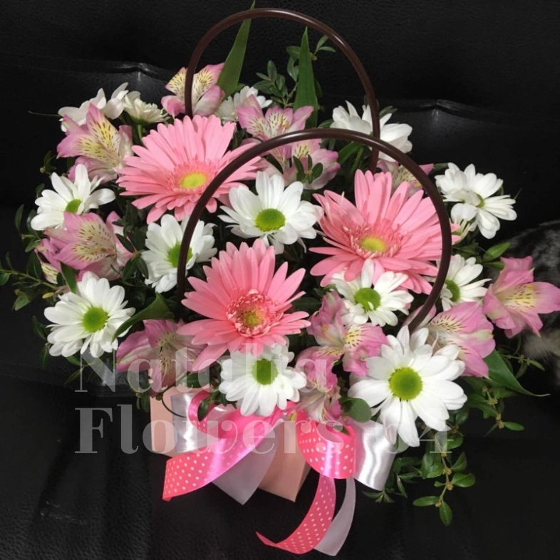 Нежная цветочная композиция, включающая розовые герберы и белые хризантемы, идеально подойдёт для выражения тёплых чувств и светлых эмоций. Букет завернут в изящную упаковку с атласной лентой, добавляющей ему элегантности и изысканности.