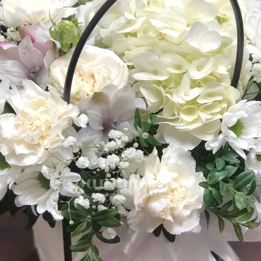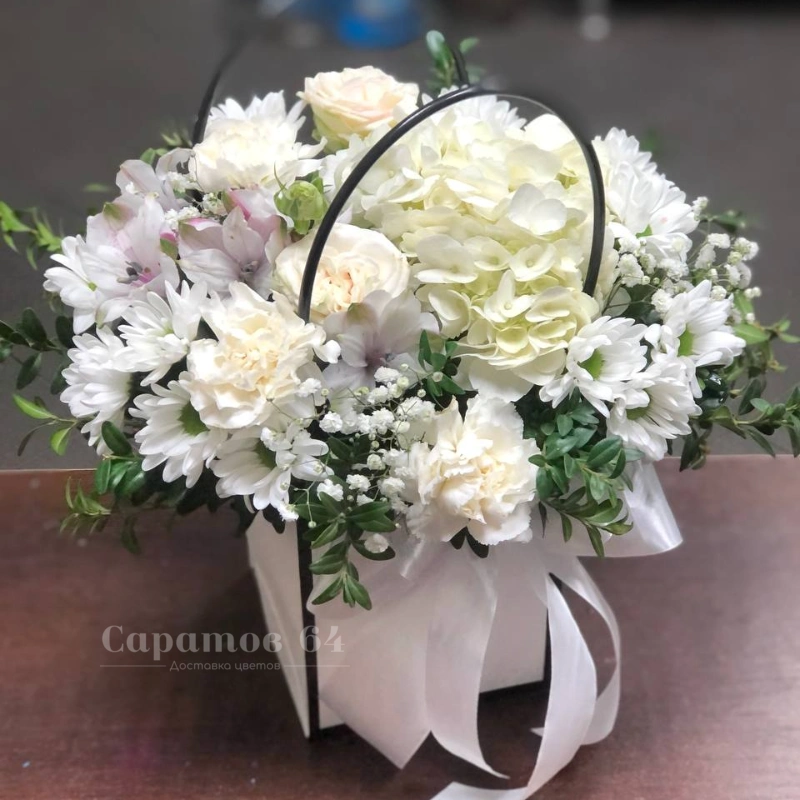 ГлавнаяКаталогКомпозицииЦветы в сумочке «снегопад»
