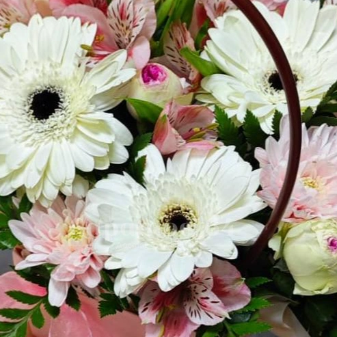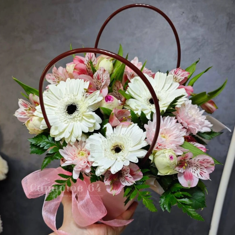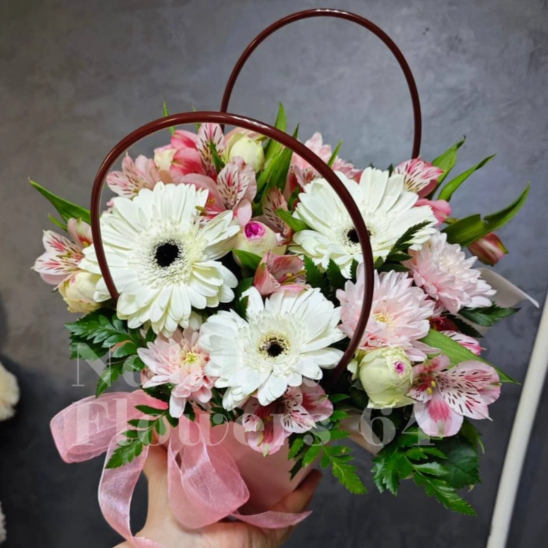 Нежный букет в светлых тонах, оформленный в виде сумочки с изящной ручкой и элегантной розовой лентой. Композиция включает белые гвоздики, розовые хризантемы и альстромерии, создавая воздушный и романтичный образ. Этот букет станет прекрасным подарком для тех, кто ценит лёгкость и красоту.