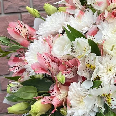 Этот букет - настоящее произведение искусства, сочетающее в себе нежные белые хризантемы, элегантные белые розы и яркие розовые альстромерии. Букет, элегантно упакованный в белую бумагу с атласной лентой, дарит ощущение свежести, радости и безграничной любви.
