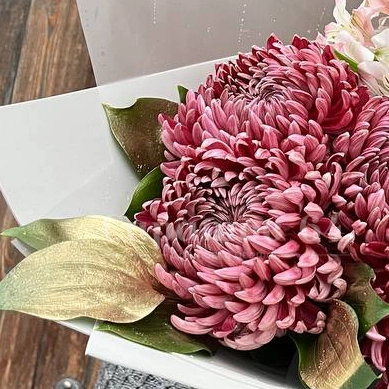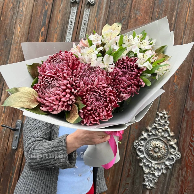 Круглый букет с хризантемами