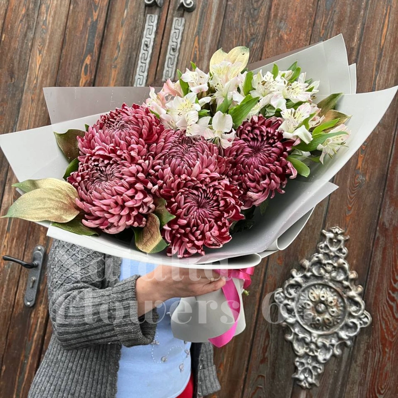 ГлавнаяКаталогБукетыБукет с хризантами и альстромерией «Золотые бигуди»