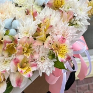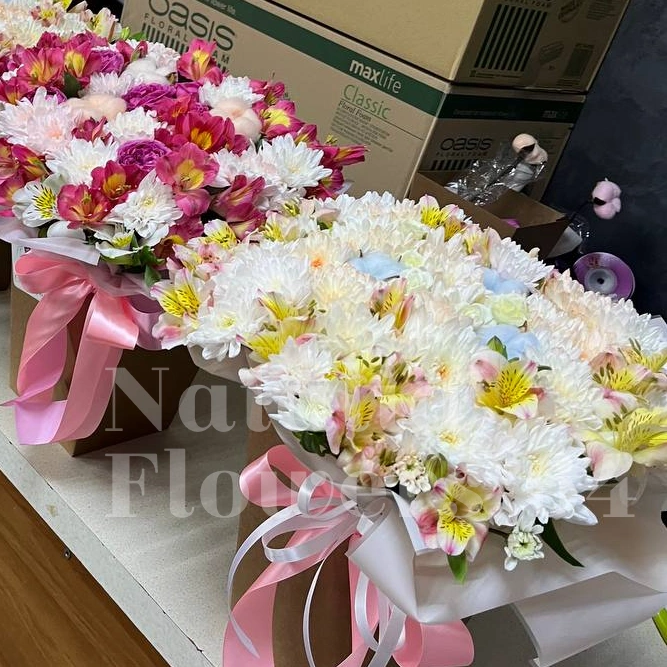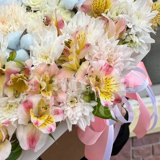 Букет, представленный на изображении, это пышная и элегантная композиция, в которую входят белые и бледно-розовые хризантемы, альстромерии с нежными оттенками и голубые гортензии, добавляющие ему воздушность. Нежные тона букета подчеркивают его свежесть и изящество, делая его прекрасным выбором для любого торжества. Дополненный атласными розовыми и белыми лентами, букет выглядит как настоящее произведение искусства, способное украсить любой особый момент.