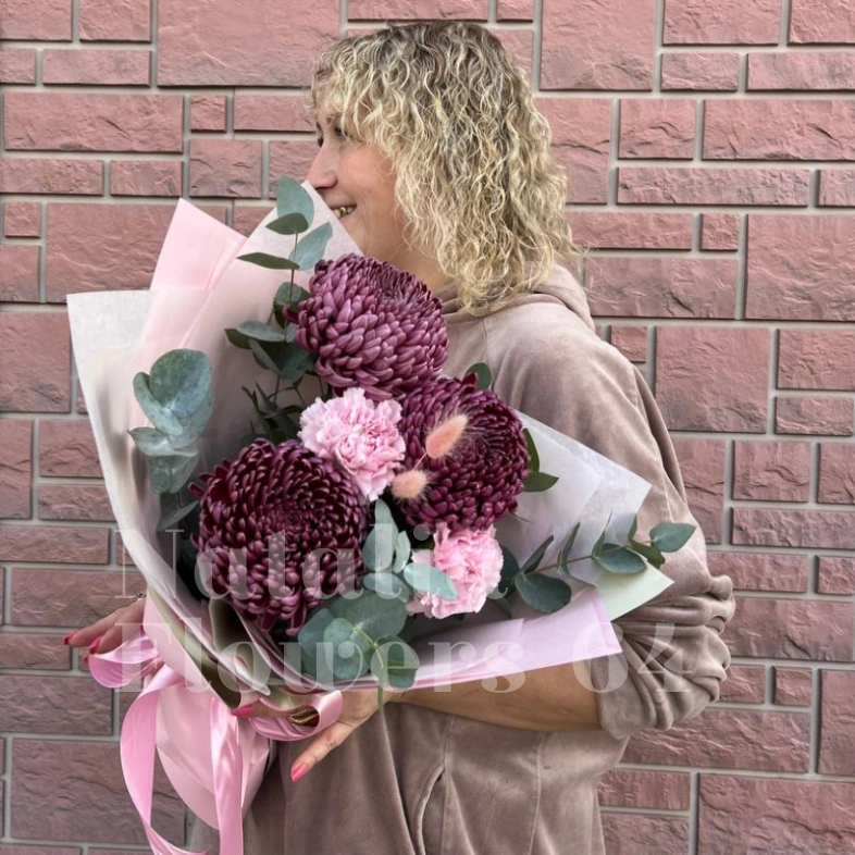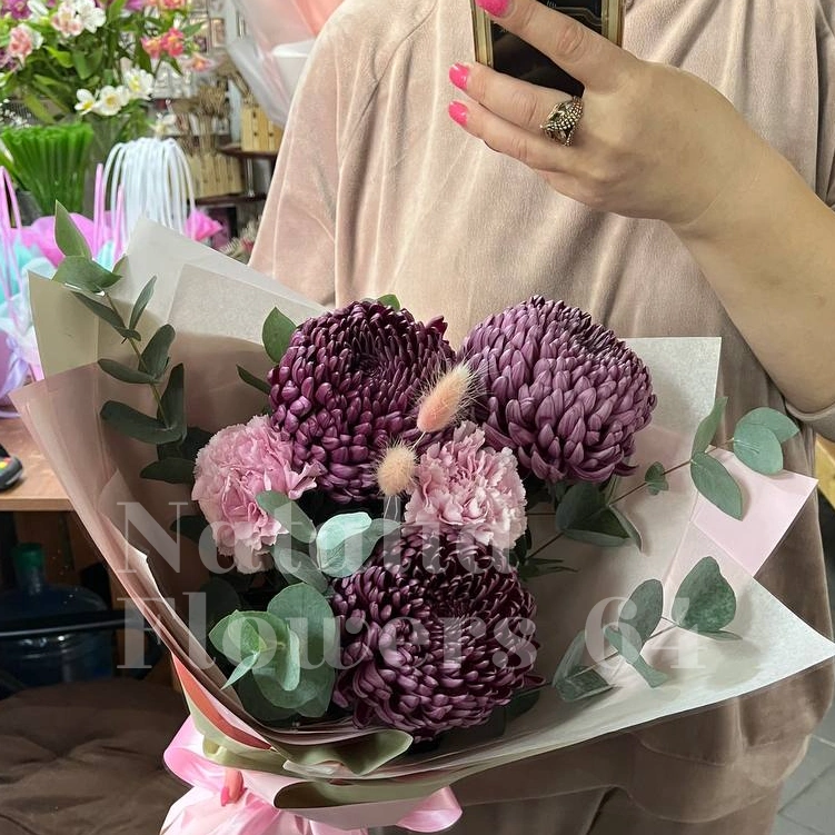 Букет, представленный на фотографии, выполнен в нежных тонах и включает в себя три крупных темно-розовых хризантемы, две более светлые розовые гвоздики и эвкалипт. Композиция завернута в светлую бумагу с атласной лентой розового цвета, что добавляет ей элегантности и изящества. Этот букет станет прекрасным подарком для ценителей красоты и гармонии.