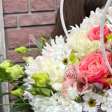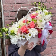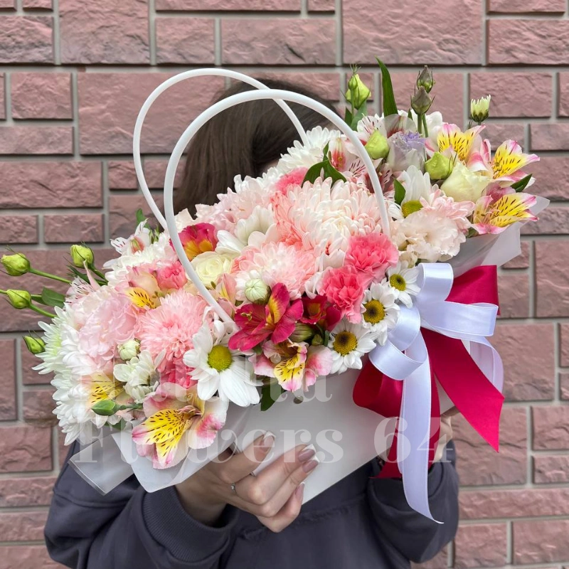 Букет в нежных оттенках розового и белого, включающий гвоздики, альстромерии и ромашки, создает воздушную и романтичную композицию. Белый короб с изящной ручкой и акцентной лентой добавляет завершенность и элегантность. Этот букет идеально подойдет для выражения нежных чувств и станет прекрасным подарком.