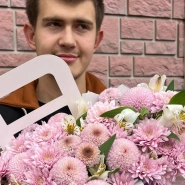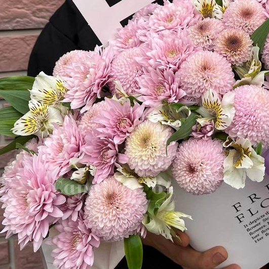 Букет ;Нежность;; ; Нежный букет, созданный из;пышных розовых хризантем и;изящных лилий. Невероятная цветочная композиция, оформленная лентами разных оттенков.