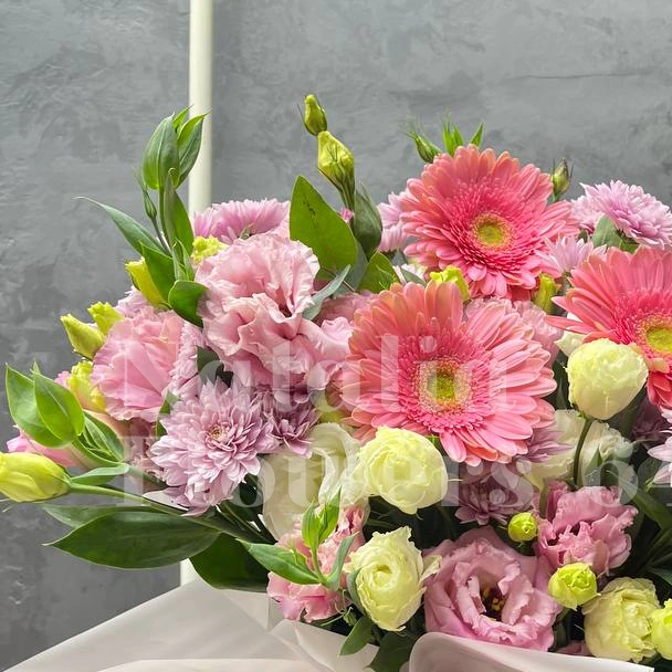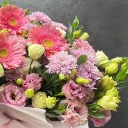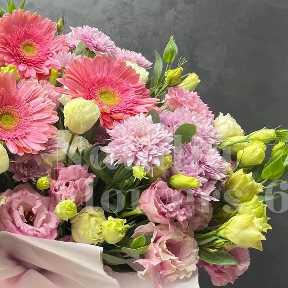 Букет, представленный на изображении, это великолепная композиция из розовых и белых цветов, включающая хризантемы, нежную эустому и герберы. Нежные оттенки создают ощущение легкости и воздушности, делая букет идеальным выбором для любого торжества. Красивая упаковка добавляет особый шарм, подчеркивая свежесть и красоту цветов.