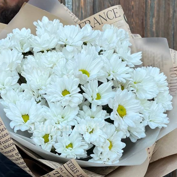 Букет из белых хризантем, символизирующих чистоту и благородство, оформлен в натуральную бумагу с декоративными элементами. Сдержанная элегантность и природная красота цветов делают его выразительным и стильным подарком. Отличный выбор для тех, кто ценит лаконичность и изящество.