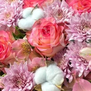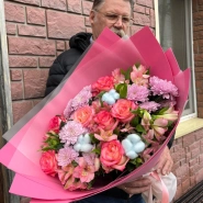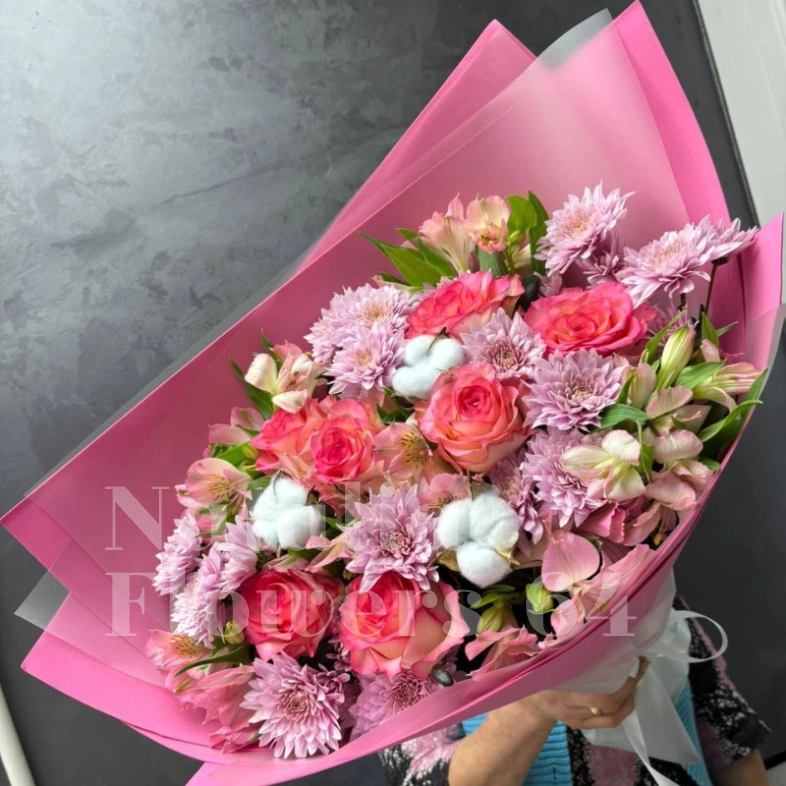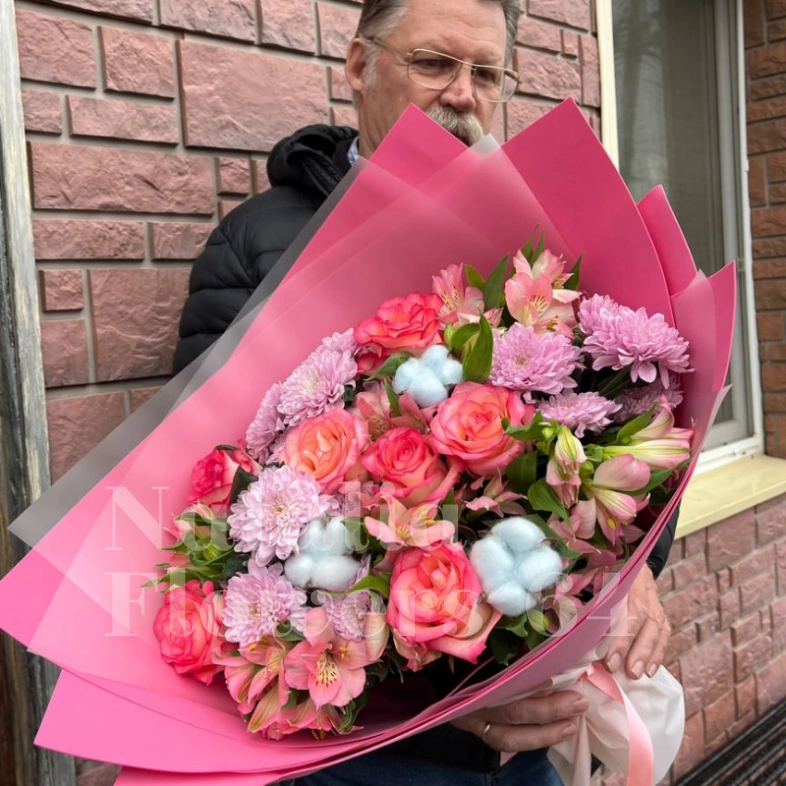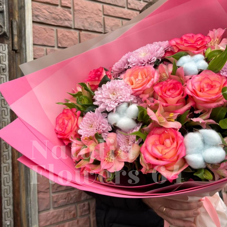 Красивый букет в розовой упаковке. Нежный и женственный букет из роз и альстромерий в розовых и персиковых тонах станет прекрасным подарком для девушек и женщин. Композиция дополнена пушистыми белыми хлопковыми шариками и другими цветами, создавая объем и текстуру.