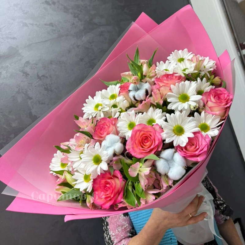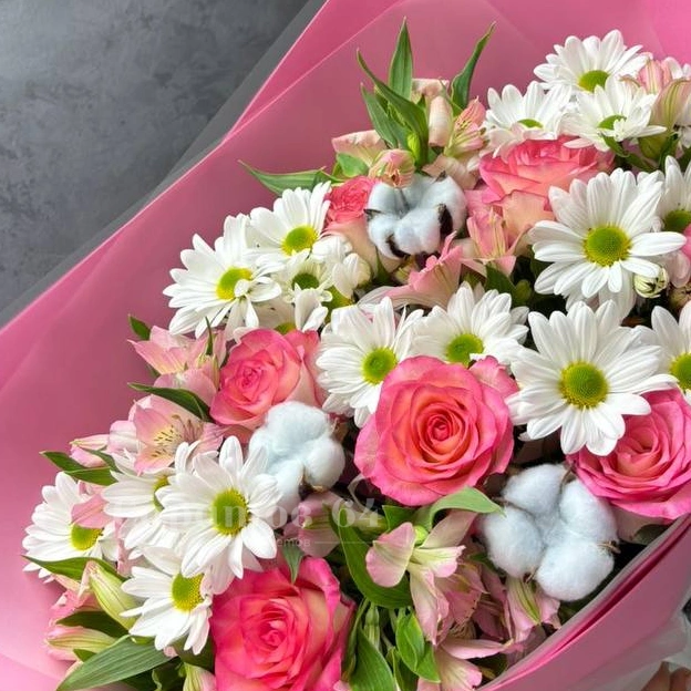 Букет представляет собой нежную композицию из розовых роз, белых хризантем и пушистого хлопка, создающую трогательный и элегантный образ. Необычная упаковка в яркий розовый цвет добавляет образу игривости и делает букет еще более запоминающимся. Этот букет станет прекрасным подарком для близких и порадует их своей красотой и свежестью.