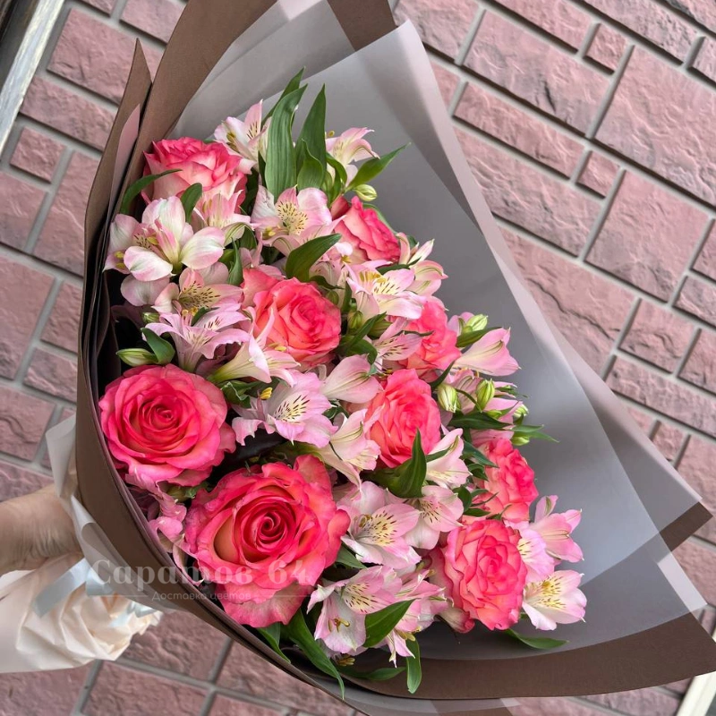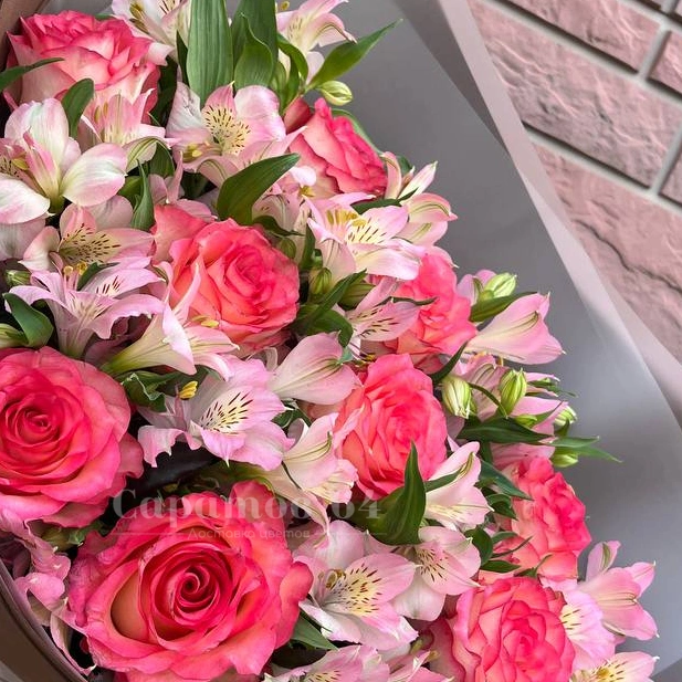 Этот букет - нежная комбинация розовых роз и альстромерий, создающая воздушный и элегантный образ. Сочетание ярких роз и изящных альстромерий наполняет композицию легкостью и теплом. Букет идеально подходит для выражения искренних чувств и эмоций.