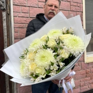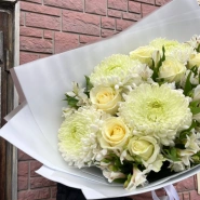 Букет из белых роз и хризантем, дополненный альстромериями, создает элегантную и нежную композицию. Сочетание разнообразных текстур и форм придает ему объем и выразительность. Этот букет станет прекрасным выражением внимания и заботы.