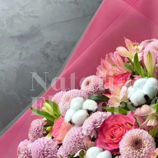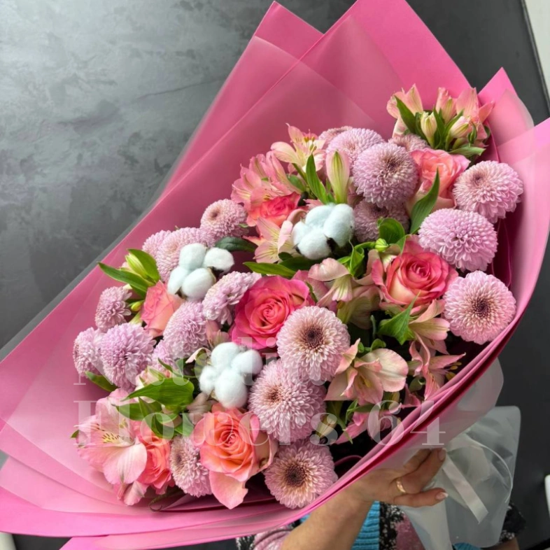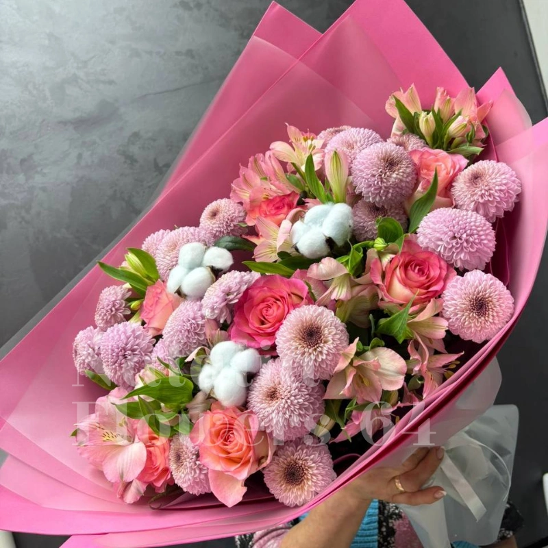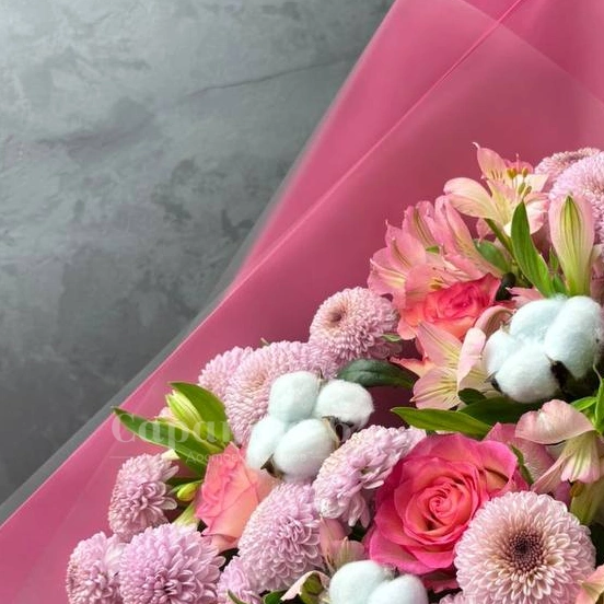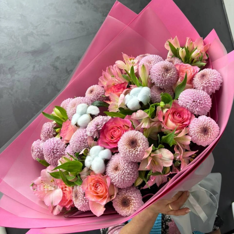 Нежный букет в розовой упаковке, состоящий из розовых и персиковых роз, пушистого хлопка и нежных хризантем. Этот букет - идеальный подарок для тех, кто ценит элегантность и изящество. Букет излучает тепло и нежность, создавая трогательный и запоминающийся образ.
