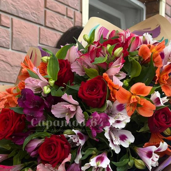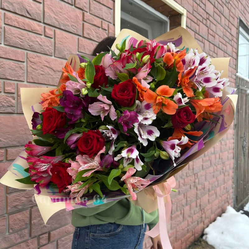 Яркий и насыщенный букет, полный жизни и красок. Розы и альстромерии переплетаются в великолепной комбинации, наполняя пространство яркими оттенками и нежным ароматом