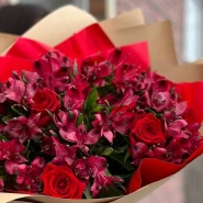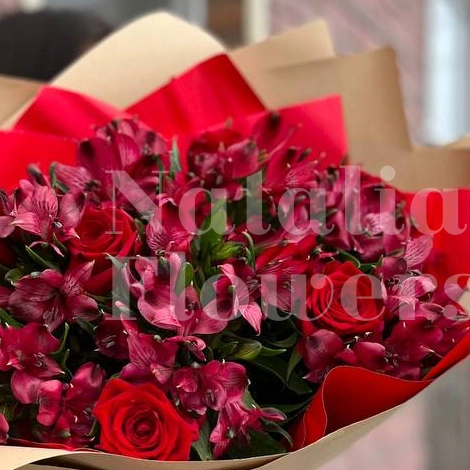 Этот букет представляет собой великолепную композицию из красных роз и алстромерий, элегантно оформленную в крафт-бумагу и перевязанную яркой красной лентой. Сочетание нежных лепестков и насыщенных оттенков создает выразительный образ, идеально подходящий для любого торжества. Букет излучает страсть и изящество, делая его прекрасным подарком для самых дорогих людей.