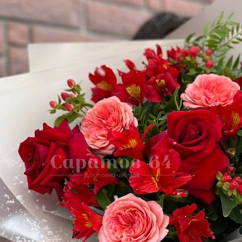 Яркий букет из красных роз и альстромерии микс