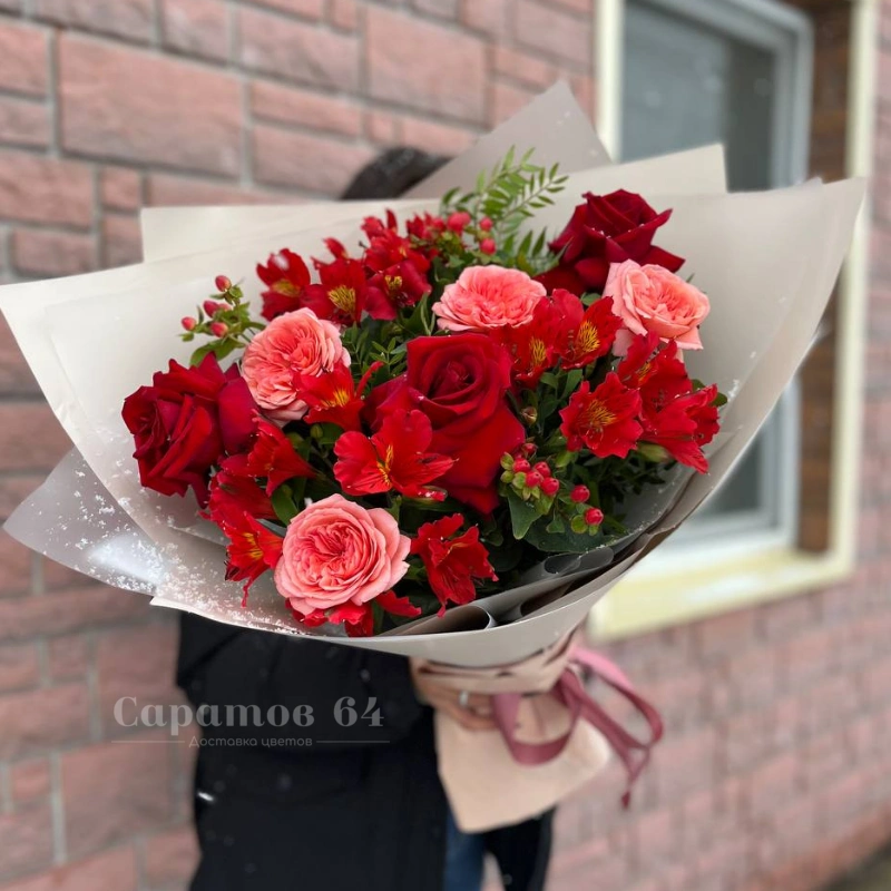 Этот букет яркое сочетание красных и розовых оттенков, созданное из свежих роз, гвоздик и альстромерий. Он олицетворяет страсть и нежность, идеально подходя для выражения сильных чувств. Пышная композиция и насыщенные цвета делают его запоминающимся подарком.