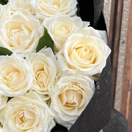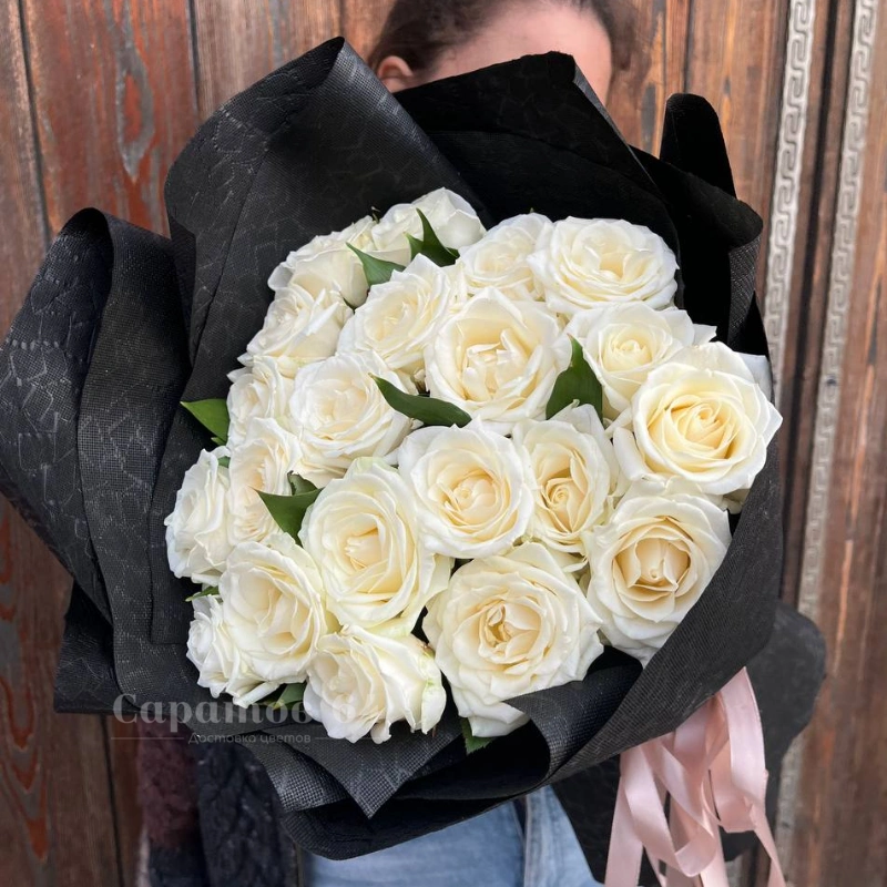 Букет из 15 белых роз, элегантно упакованный в черную бумагу и дополненный нежной розовой лентой, создает впечатление сдержанной роскоши и изысканности. Этот классический букет идеально подходит для выражения глубоких чувств и элегантного оформления любого торжества. Белые розы символизируют чистоту и искренность, делая их прекрасным выбором для особого случая.