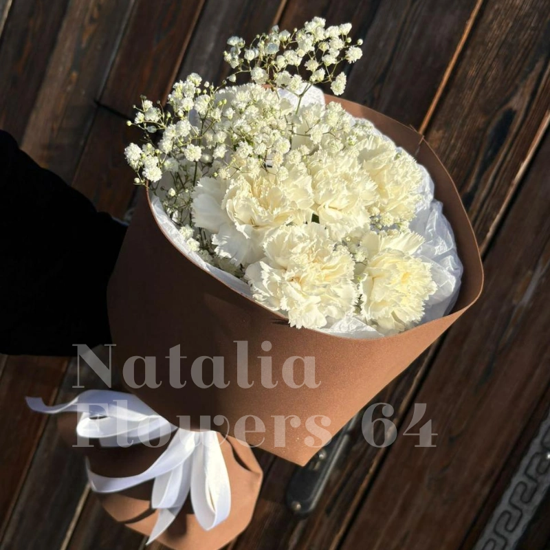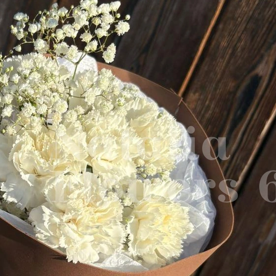 Букет из белых гвоздик и гипсофилы, оформленный в коричневую упаковку с атласной лентой. Нежные цветы создают воздушную композицию, идеальную для выражения светлых чувств и тёплых пожеланий. Этот букет станет прекрасным подарком для любого торжества.