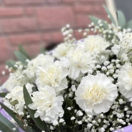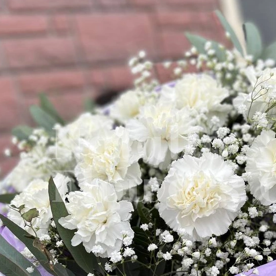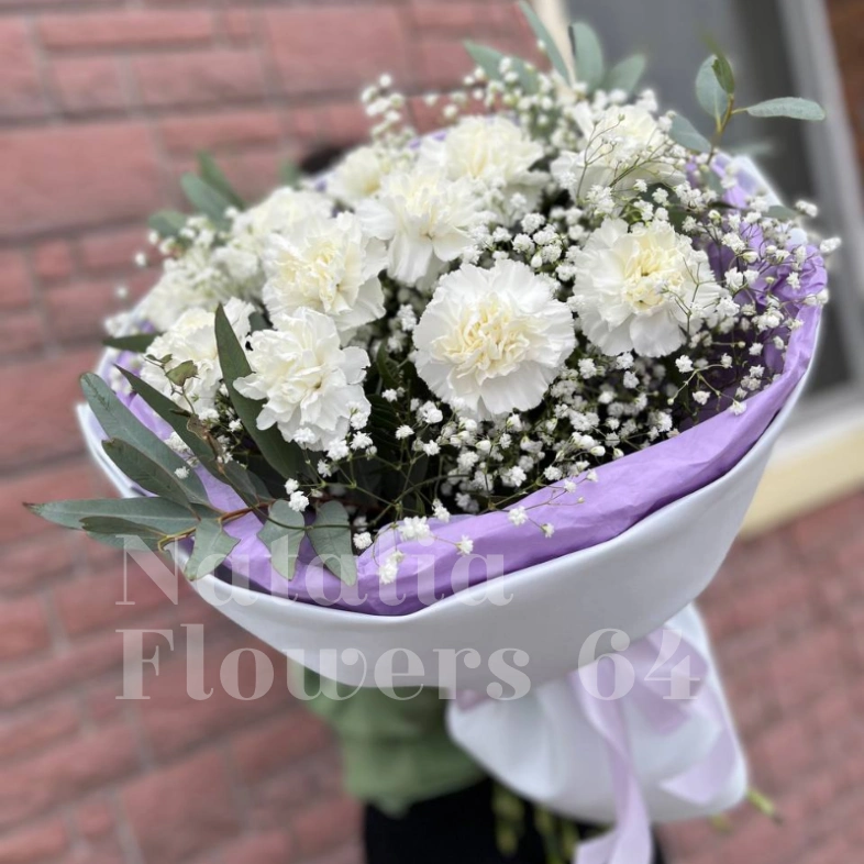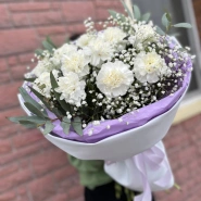 Букет из свежих белых гвоздик и гипсофилы, дополненный зеленью эвкалипта и элегантно оформленный в светло-фиолетовой упаковке с белой лентой. Этот нежный и воздушный букет создаст атмосферу чистоты и утонченности, идеально подходящую для любого торжества. Белые цветы символизируют нежность и искренность, делая букет прекрасным подарком.