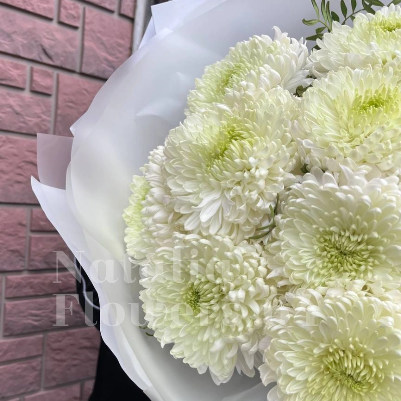 Букет из белых хризантем, элегантно упакованный в белую бумагу с воздушной лентой, создаёт ощущение чистоты и изящества. Хризантемы, символизирующие долголетие и счастье, идеально подходят для выражения глубоких чувств. Этот букет станет прекрасным подарком для близких и дорогих людей.
