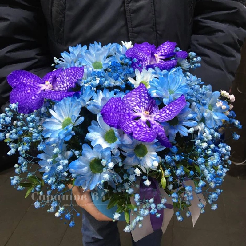 ГлавнаяКаталогКомпозицииКомпозиция в шляпной коробке «синяя орхидея»