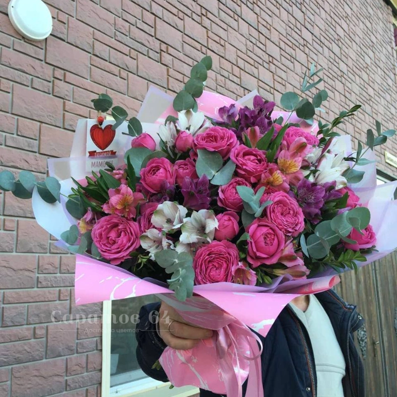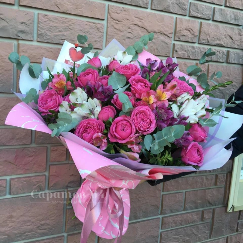 Круглый букет розовый микс с альстромерией, розами и хризантемой