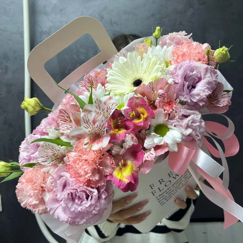 Цветы в коробке-трапеции  микс с малиновыми альстромериями