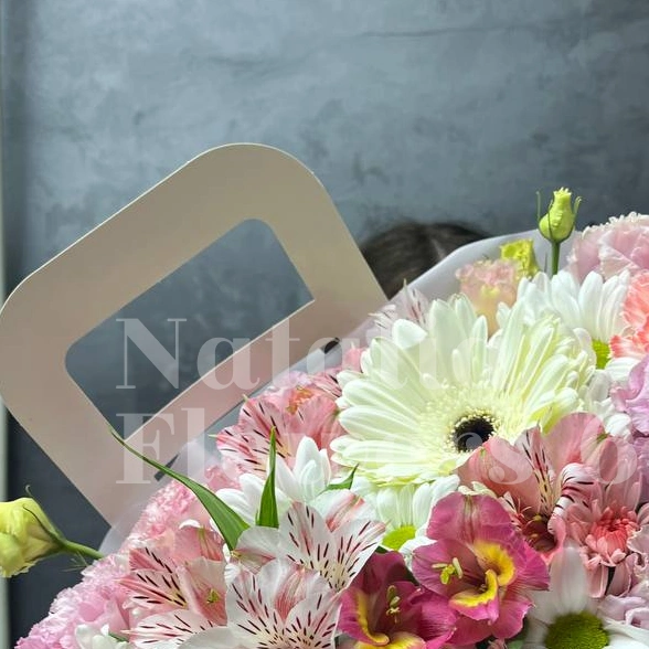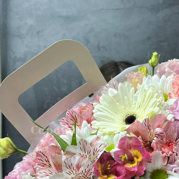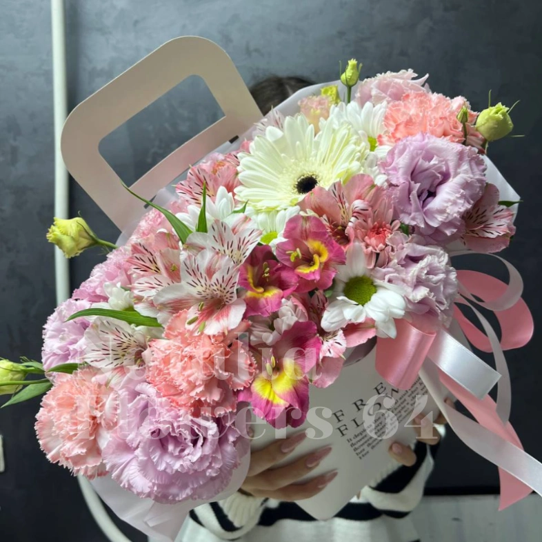 ГлавнаяКаталогКомпозицииЦветы в картонной сумочке «белая гербера»