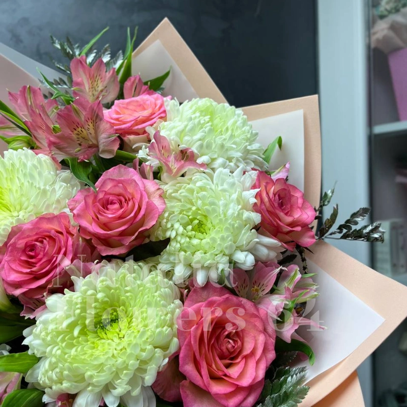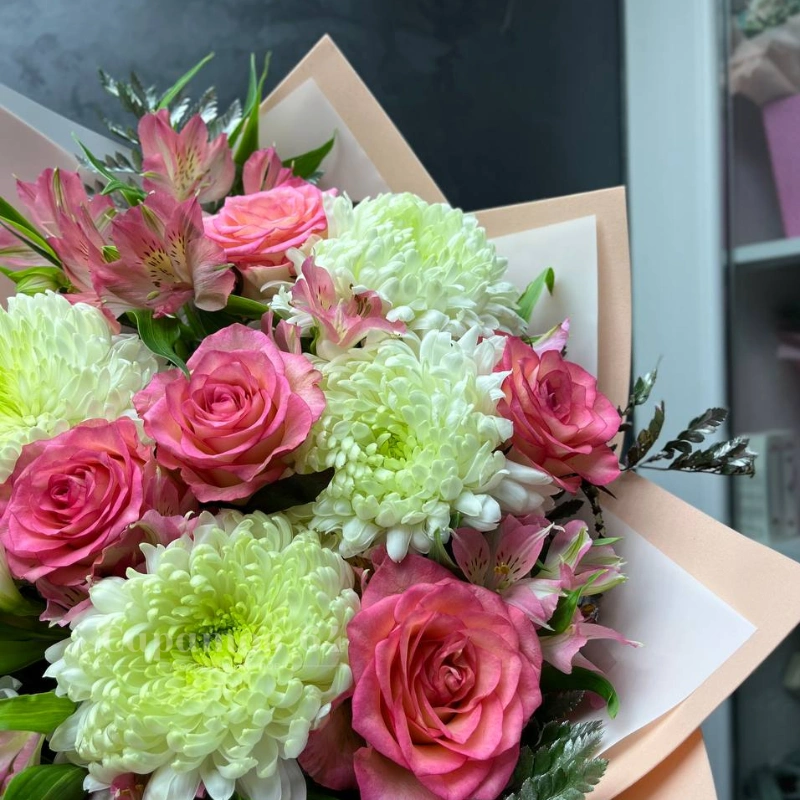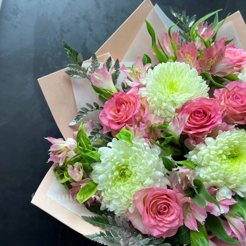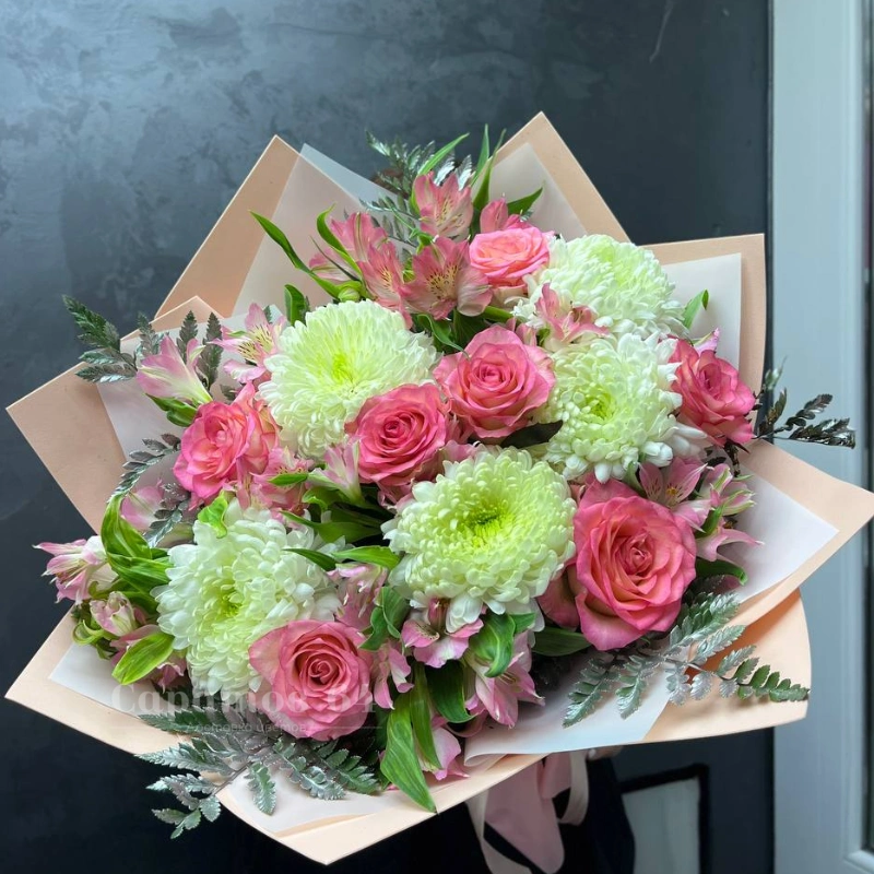 Букет, в котором главными цветами являются розовые розы и белые хризантемы, выглядит воздушно и нежно. Необычное сочетание этих цветов создаёт элегантный образ, идеальный для любого торжества. Розы добавляют букету романтичности, а пышные хризантемы - воздушности и насыщенности.