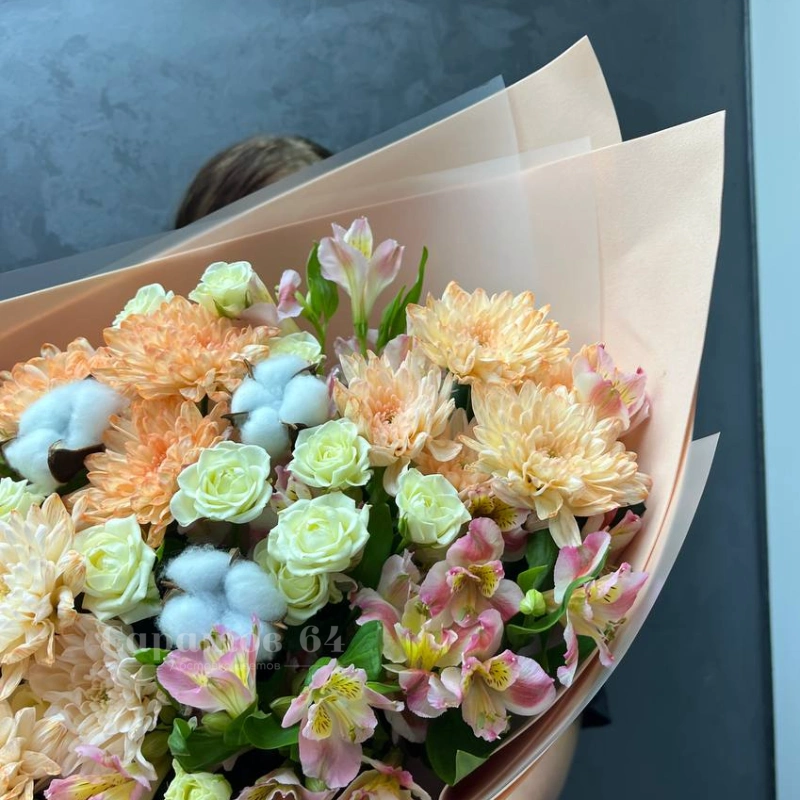 Букет представляет собой нежное сочетание розовых, персиковых и белых оттенков, создавая гармоничный образ. В его состав входят цветы различных сортов, включая крупные персиковые хризантемы, розовые и белые розы, а также альстромерии с их изящными лепестками. Букет идеально подойдёт для тех, кто ценит сдержанную элегантность и воздушность композиции.