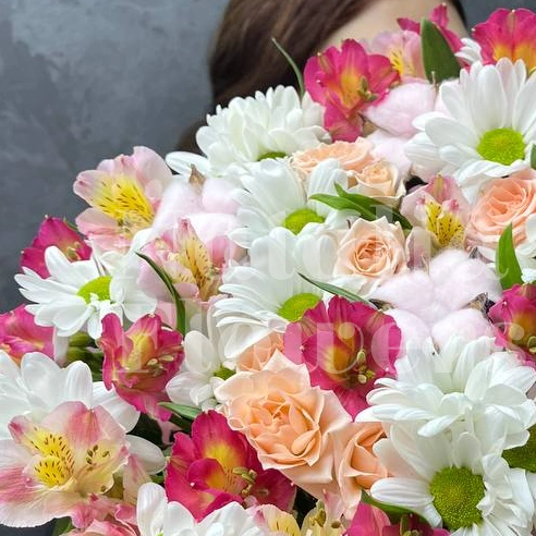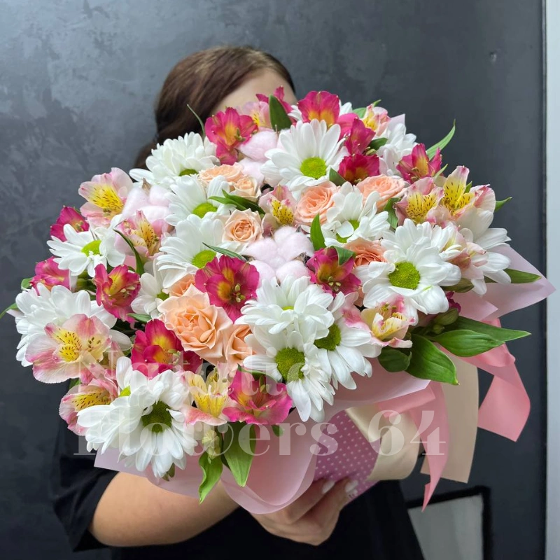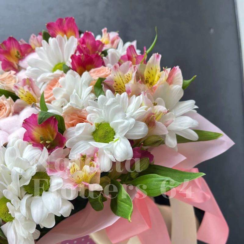 Этот букет - нежное сочетание розовых и белых оттенков, создающее ощущение легкости и воздушности. В его состав входят ромашки, розы и альстромерии, которые придают композиции свежесть и природную красоту. Букет идеально подходит для выражения нежных чувств и эмоций.