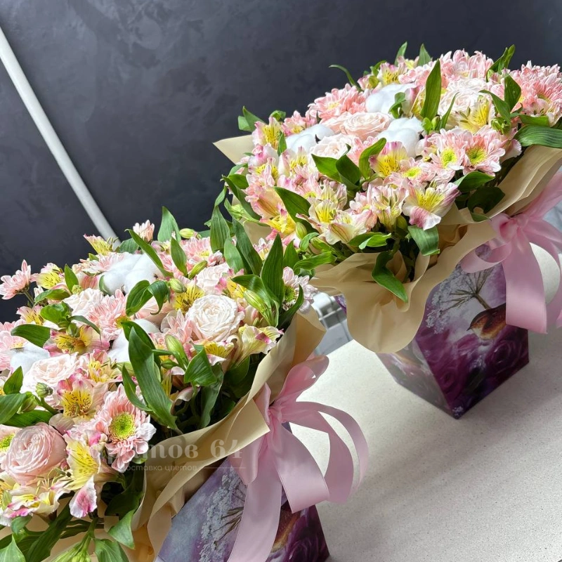 Композиция в коробке из хризантем, альстромерий, роз и хлопка