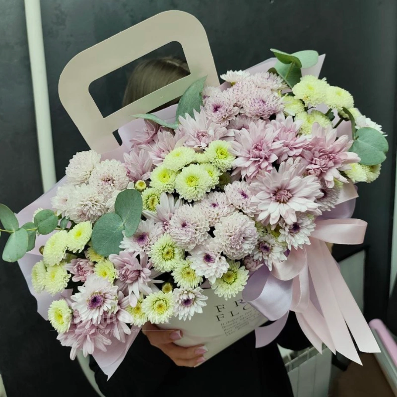 Композиция зи хризантем и эвкалипта в нежных тонах