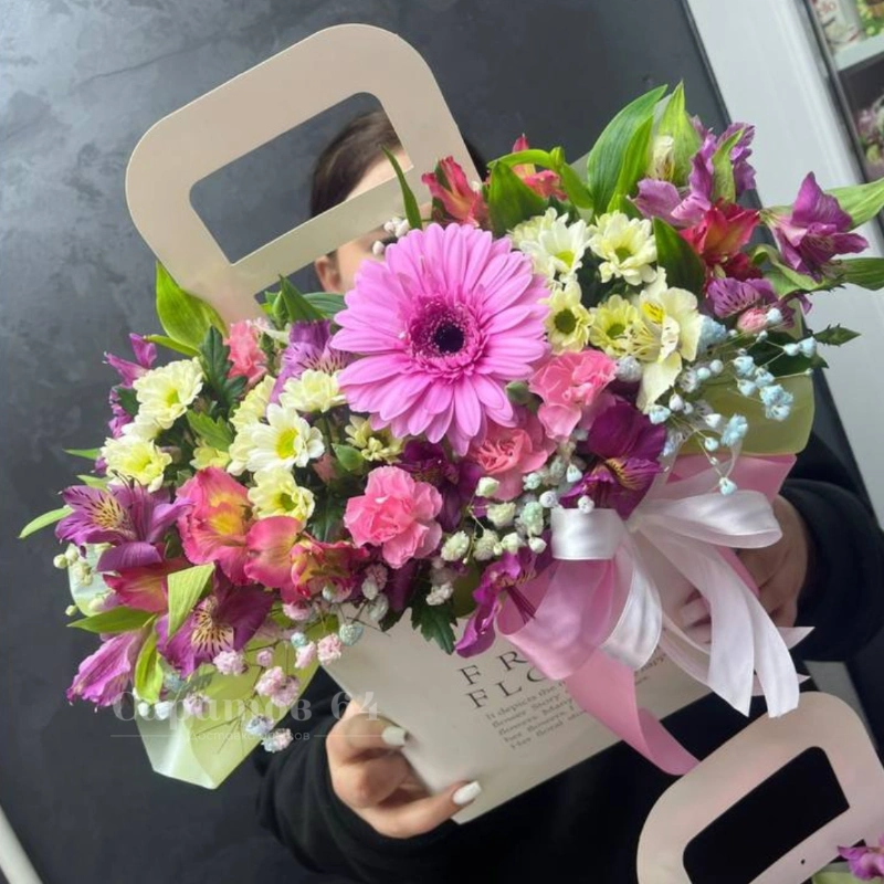 Цветы в коробке микс с герберой, альстромериями, диантусами и хризантемами