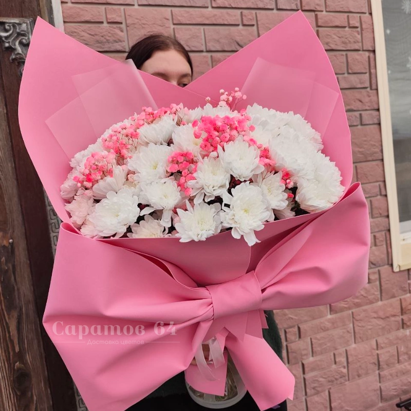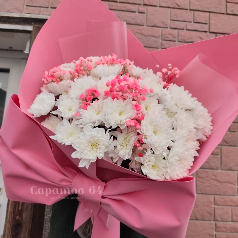 Букет с хризантемами и гипсофилой «Барби»
