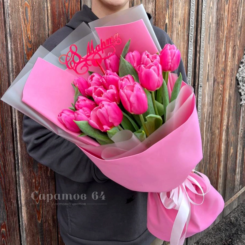 15 розовых тюльпанов в розовом оформлении