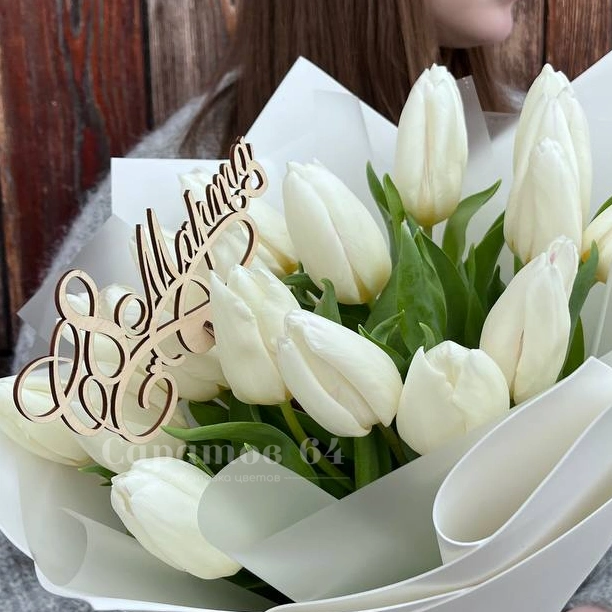 ГлавнаяКаталог8 марта17 белых тюльпанов в оформлении