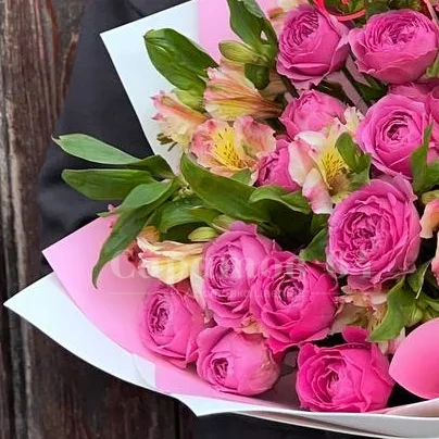 Букет с пионовидной кустовой розой и альстромерией