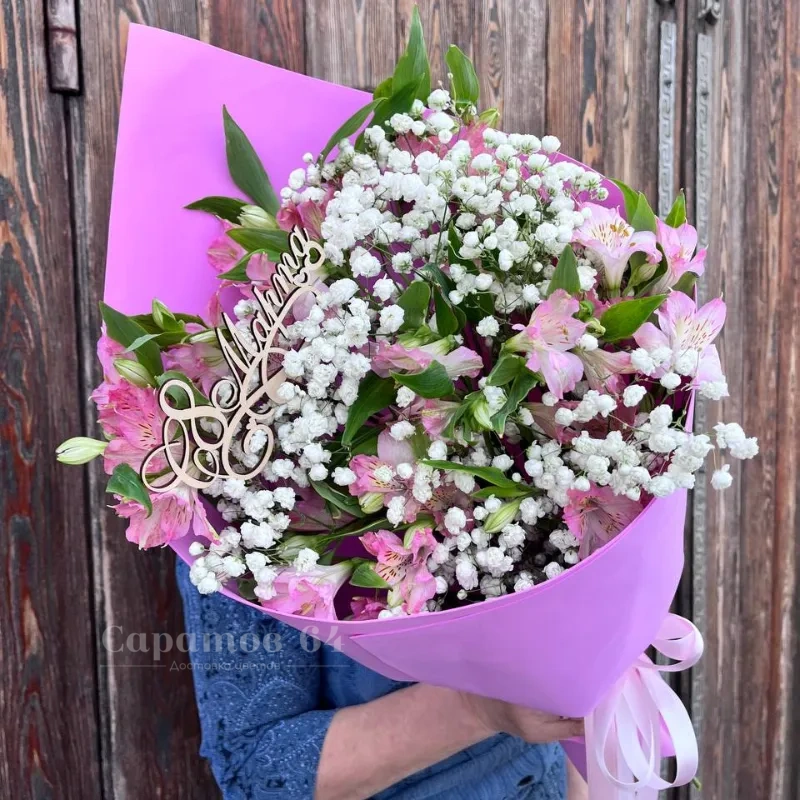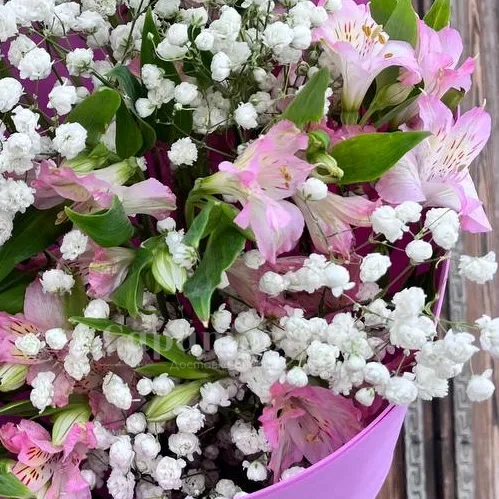 Букет 7 розовых альстромерий и гипсофила